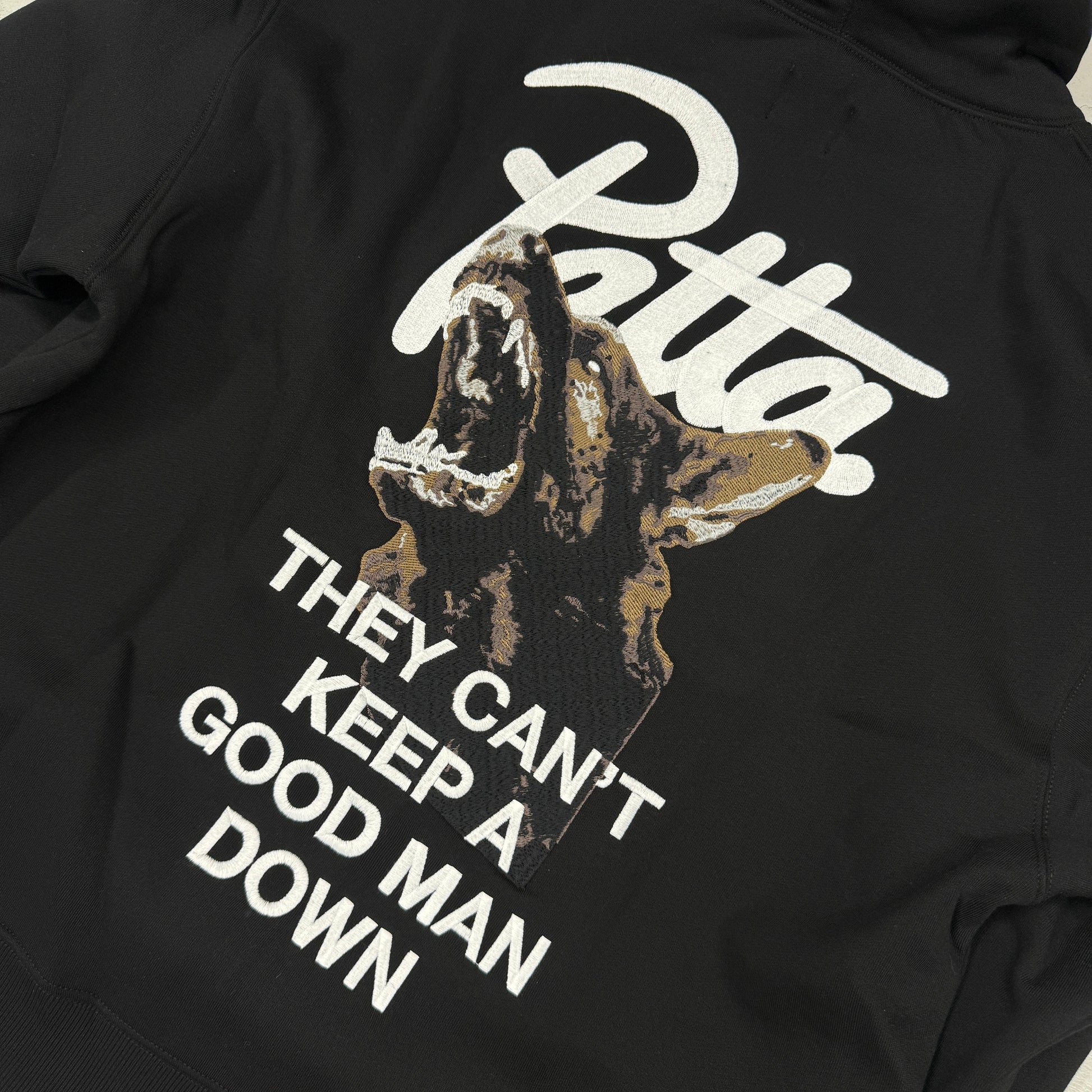 The Patta Bark Boxy Hooded Sweater in Black comes in 420gsm Cotton and Polyester blend. Featuring an eye catching premium Patta Dog embroidered graphic on the back .