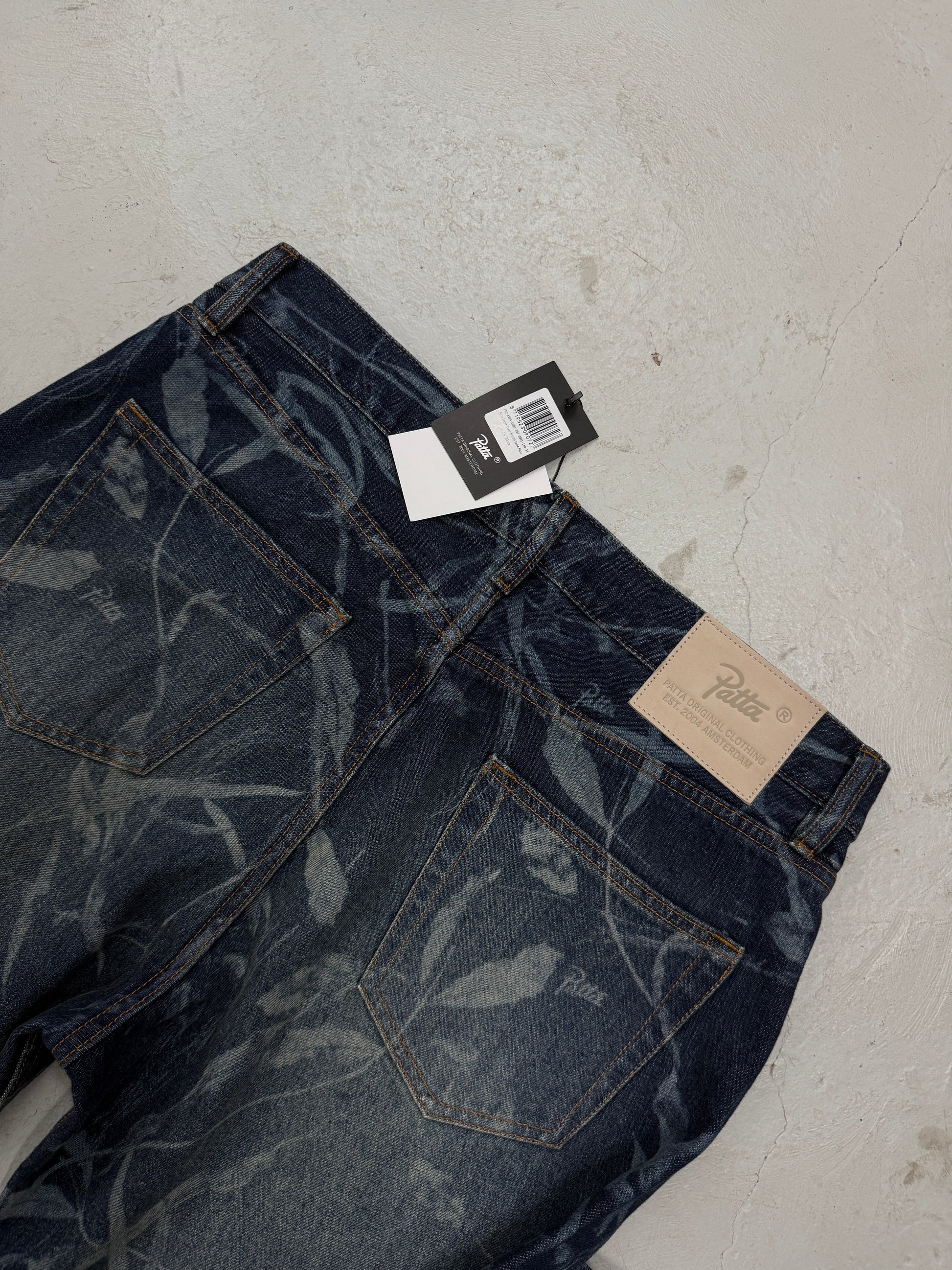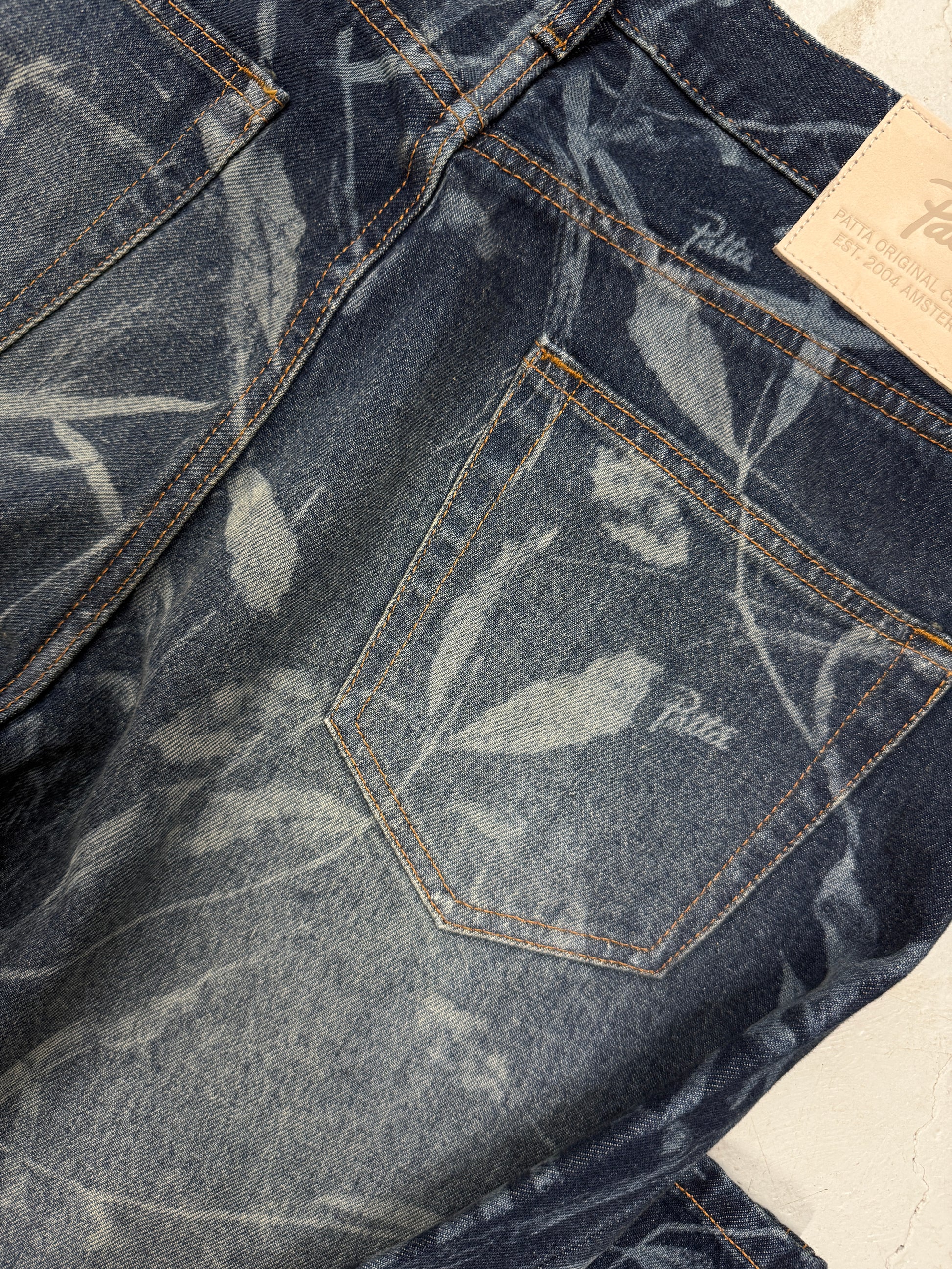 These Denim Pants stands out with its allover laser printed Patta Leaves pattern. The 14 oz mid-heavyweight Jeans have a straight fit and feature two side pockets, two back pockets, a buttoned fly, branded buttons and branded rivets. Adorned with contrasting Bronze stitching and a branded back patch.
